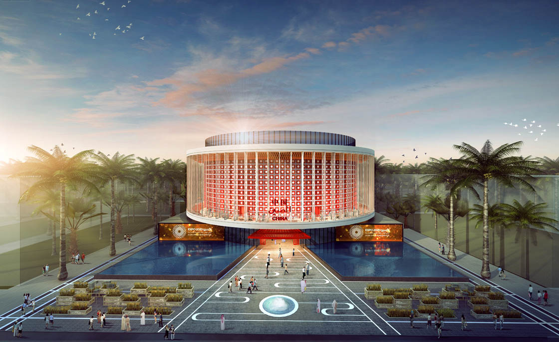 中国馆位于园区中心地带,紧邻“机遇”主题馆,地块面积4636平方米,建筑高度23.8米,建筑面积5459.1平米,展览面积2201平方米,景观面积2240平方米。中国馆由地上四层组成,主体建筑结构由钢结构、钢筋混凝土核心筒组成。建筑物由方形基座,圆形折叠的外墙,红色模块矩阵,环形包围,体现了中华文化天圆地方的深远寓意。中国馆的人流动线从一楼的入口大厅开始(VIP在建筑物北侧的入口处),各层展厅是通过坡道相连。参观结束后,人们沿建筑外圈环廊步行回到首层大厅,并欣赏广场的景色。商店和餐馆位于出口的两侧,3楼专为办公室区域和VIP会议区域而设计,还有一个中央中庭带来充足的阳光和自然通风。